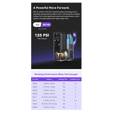 AS2 Pro posiada wbudowany akumulator, który można szybko naładować w ciągu 30 minut. Pełne naładowanie pozwala na napompowanie do dwóch opon 700C25 do ciśnienia 110 PSI lub czterech opon do 80 PSI. Dzięki uniwersalnemu interfejsowi typu C, ładowanie jest proste i szybkie.